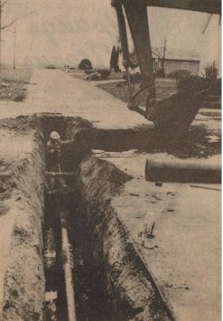 The Treaty Company has been proud to count Finfrock Construction as a customer since 1955 and Tom and Dona have joined the Treaty Travelers on trips to various parts of the world. The Finfrocks are life long residents of the Covington area. Tom was one of the first football players at Covington High School. Also a high school track star, his records still stand in the quarter mile and 220-yard dash. Tom is a life member of the VFW and American Legion and belongs to the Miami County Homebuilders Assn. The Finfrocks have a motor home which they use frequently. During nice weather they take it to Celina to where they relax on their pontoon. About six weeks each winter they take it to Florida and in the spring the direction is reversed to Michigan to hunt mushrooms. (Above) Rich McMaken, Covington water and sewer superintendent, checks progress of the job. Finfrock Construction is installing U. S. Pipe Ductile Iron Class 53 water main in the village. Also being used are Mueller valves, fitting and hydrants. The project calls for installation of nearly 9,000 feet of water line. |