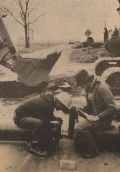 ![]() Treaty's Tom Jenkins chats with Rich McMaken and Tom Finfrock at site of Covington water project. ![]() The equipment wasn't very mechanized when Roger Finfrock was working on Wenrick Street in 1949. That's Roger at left in the photo above. His son and grandchildren now keep the company running smoothly. Tom is responsible for the bidding, purchasing, collections and supervision of jobs. Tom's two sons, Roger, 24, and Paul, 22, work full-time for the company. Daughter Crystal, who is secretary to the Troy athletic director, helps with the books on evenings and weekends. Mrs. Finfrock (Dona) also plays an active role in the business.
